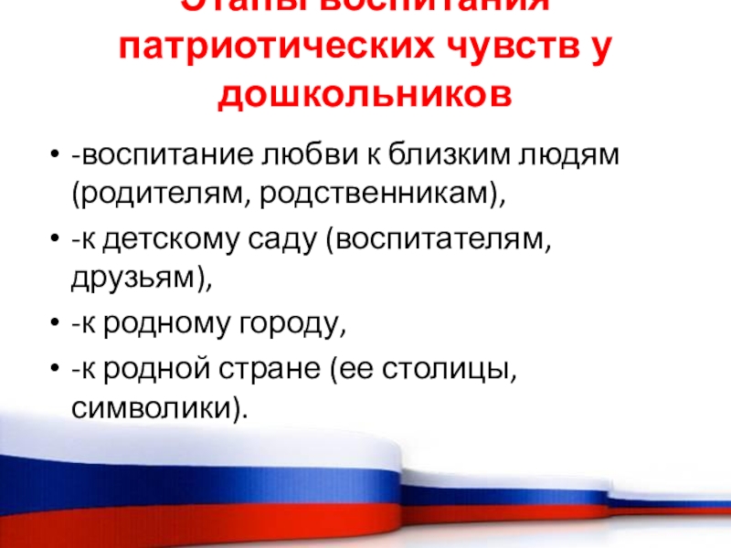 Слайд 15Этапы воспитания патриотических чувств у дошкольников