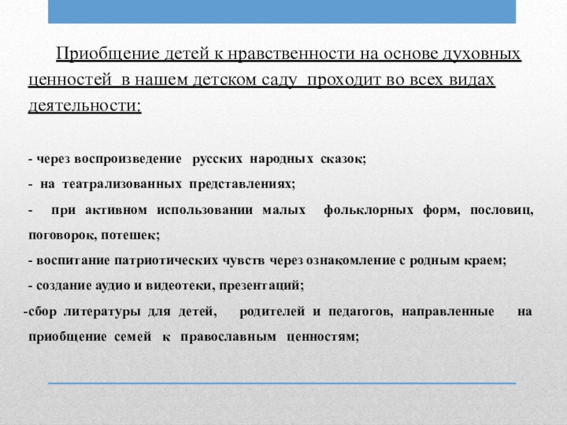Слайд 12Приобщение детей к нравственности на основе духовных ценностей в нашем