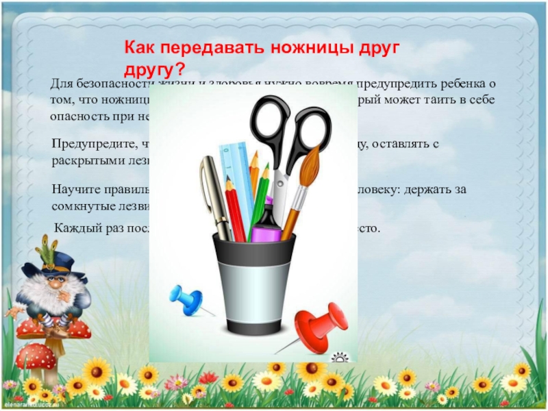 Научите правильно передавать ножницы другому человеку: держать за сомкнутые лезвия и передавать .