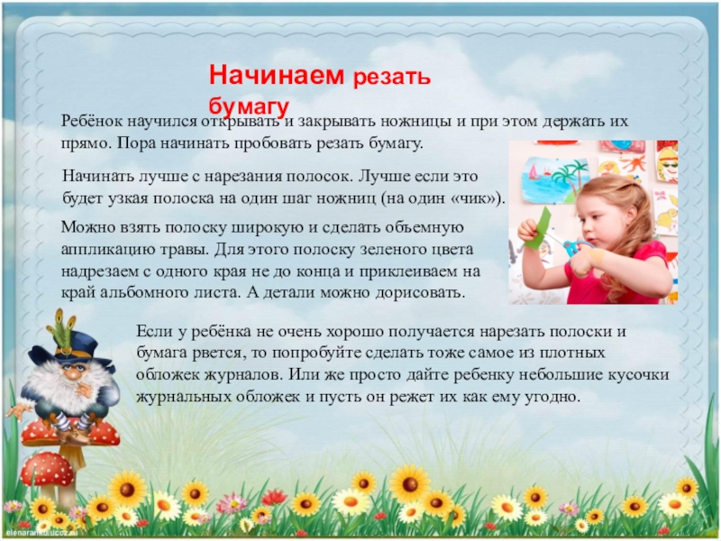 Если у ребёнка не очень хорошо получается нарезать полоски и бумага рвется, то попробуйте сделать тоже самое из плотных обложек журналов. Или же просто дайте ребенку небольшие кусочки журнальных обложек и пусть он режет их как ему угодно.