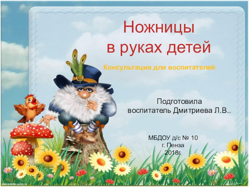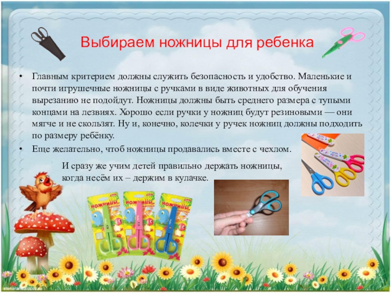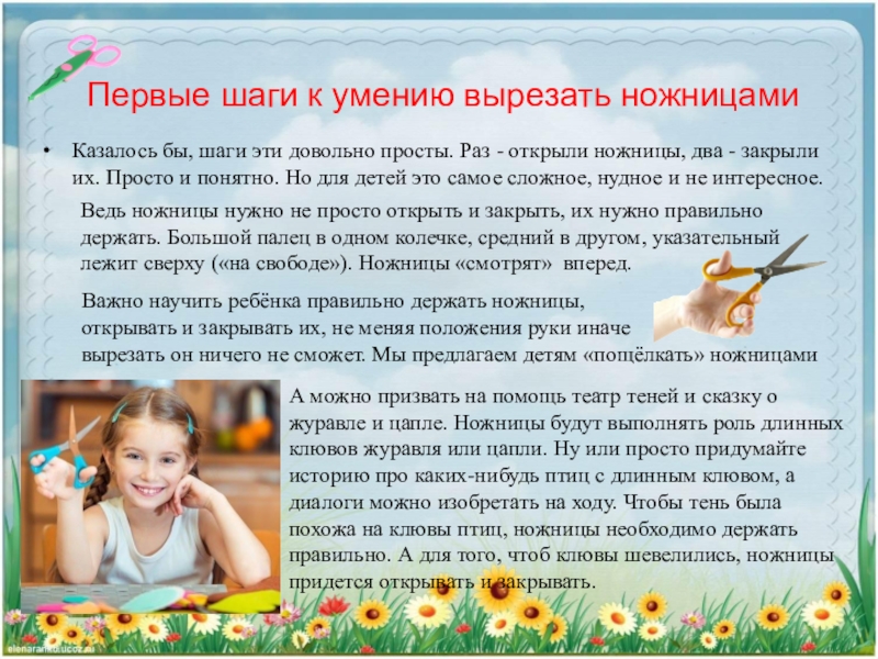 Ведь ножницы нужно не просто открыть и закрыть, их нужно правильно держать. Большой палец в одном колечке, средний в другом, указательный лежит сверху («на свободе»). Ножницы «смотрят» вперед.