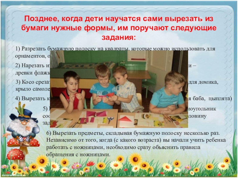 1) Разрезать бумажную полоску на квадраты, которые можно использовать для орнаментов, окошек игрушечных домиков, флажков и т.д.