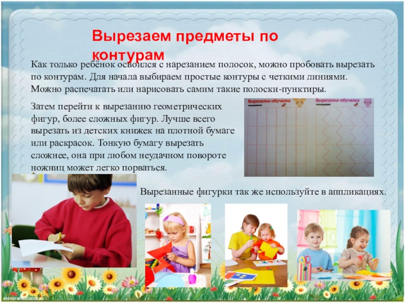 Затем перейти к вырезанию геометрических фигур, более сложных фигур. Лучше всего вырезать из детских книжек на плотной бумаге или раскрасок. Тонкую бумагу вырезать сложнее, она при любом неудачном повороте ножниц может легко порваться.