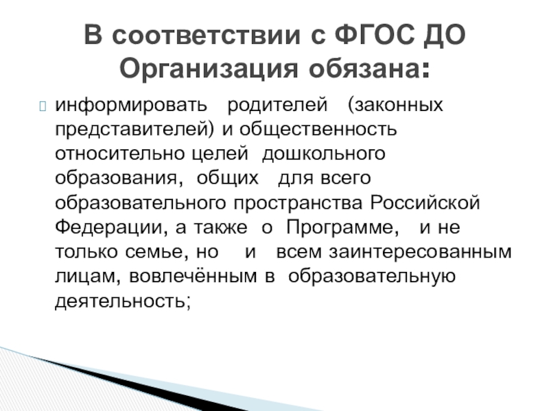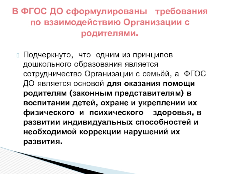 В ФГОС ДО сформулированы требования по взаимодействию Организации с родителями.
