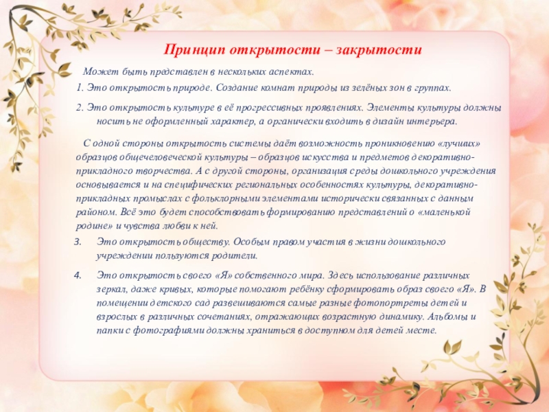 С одной стороны открытость системы даёт возможность проникновению «лучших» образцов общечеловеческой культуры – образцов искусства и предметов декоративно-прикладного творчества. А с другой стороны, организация среды дошкольного учреждения основывается и на специфических региональных особенностях культуры, декоративно-прикладных промыслах с фольклорными элементами исторически связанных с данным районом. Всё это будет способствовать формированию представлений о «маленькой родине» и чувства любви к ней.