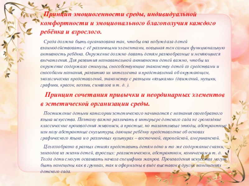 Слайд 8Принцип эмоциогенности среды, индивидуальной комфортности и эмоционального благополучия каждого ребёнка и