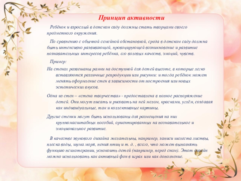 2. Один из основных факторов, определяющих возможность реализации принципа активности – создание игровой среды, обеспечивающей ребёнку возможность двигаться.