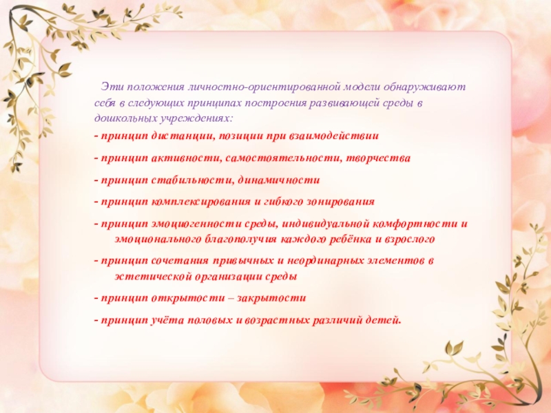 Слайд 4Эти положения личностно-ориентированной модели обнаруживают себя в следующих принципах построения развивающей