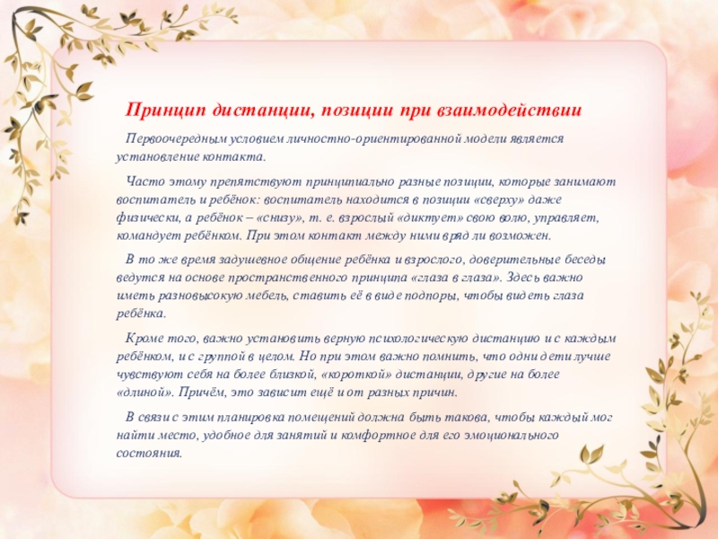 этому препятствуют принципиально разные позиции, которые занимают воспитатель и ребёнок: воспитатель находится в позиции «сверху» даже физически, а ребёнок – «снизу», т. е. взрослый «диктует» свою волю, управляет, командует ребёнком. При этом контакт между ними вряд ли возможен.