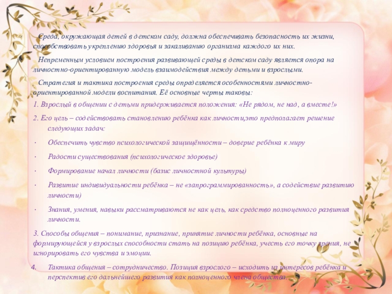 Непременным условием построения развивающей среды в детском саду является опора на личностно-ориентированную модель взаимодействия между детьми и взрослыми.