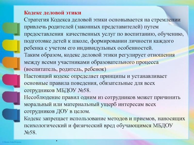 родителей (законных представителей) путем предоставления качественных услуг по воспитанию, обучению, подготовке детей к школе, формировании личности каждого ребенка с учетом его индивидульных особенностей. Таким образом, кодекс деловой этики регулирует отношения между всеми участниками образовательного процесса (воспитатель, родитель, ребенок) Настоящий кодекс определяет принципы и устанавливает основные правила поведения, обязательные для всех сотрудников МБДОУ №58. Несоблюдение правил одним из сотрудников может причинить моральный или материальный ущерб интересам всех сотрудников ДОУ в целом. Кодекс запрещает использование методов и приемов, наносящих психологический и физический вред обучающимся МБДОУ №58. .