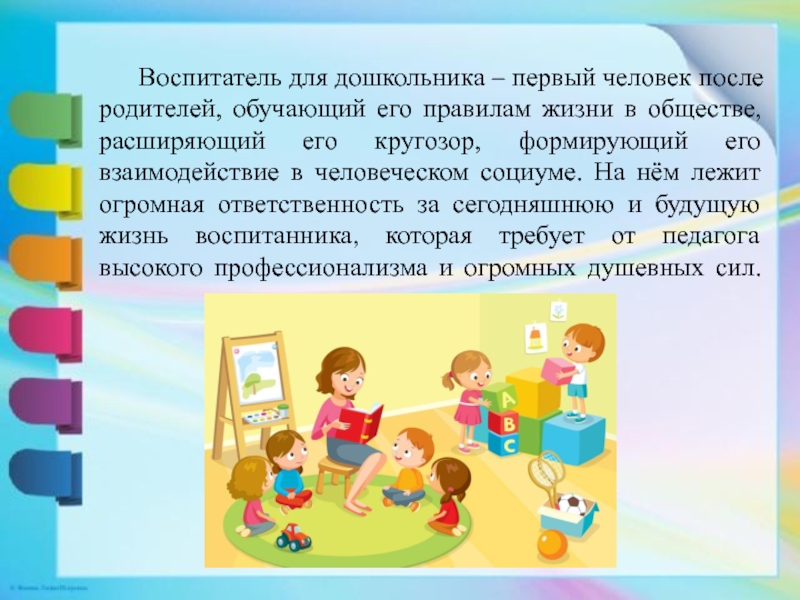 Воспитатель для дошкольника – первый человек после родителей, обучающий его правилам жизни в обществе, расширяющий его кругозор,