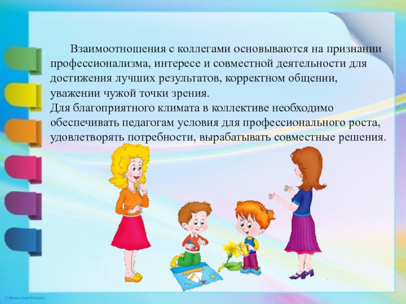 Слайд 5Взаимоотношения с коллегами основываются на признании профессионализма, интересе и совместной деятельности