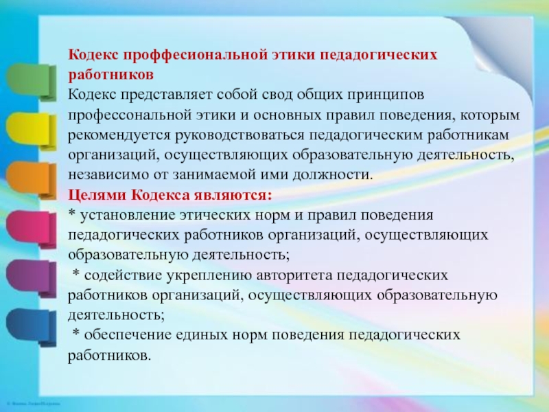 профессональной этики и основных правил поведения, которым рекомендуется руководствоваться педадогическим работникам организаций, осуществляющих образовательную деятельность, независимо от занимаемой ими должности. Целями Кодекса являются: * установление этических норм и правил поведения педадогических работников организаций, осуществляющих образовательную деятельность; * содействие укреплению авторитета педадогических работников организаций, осуществляющих образовательную деятельность; * обеспечение единых норм поведения педадогических работников.