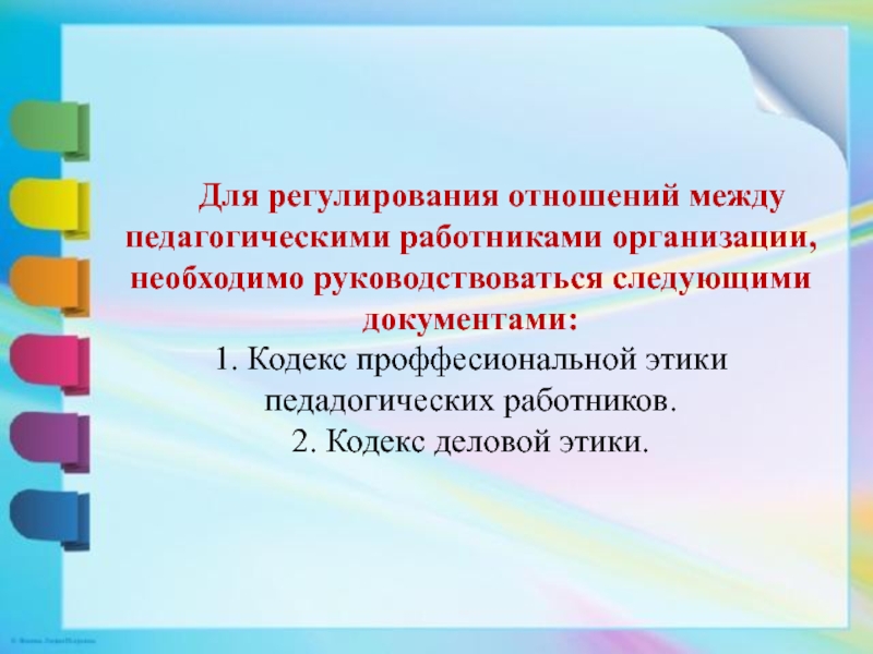 Слайд 6Для регулирования отношений между педагогическими работниками организации, необходимо руководствоваться следующими документами: 1.