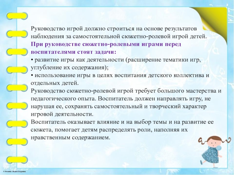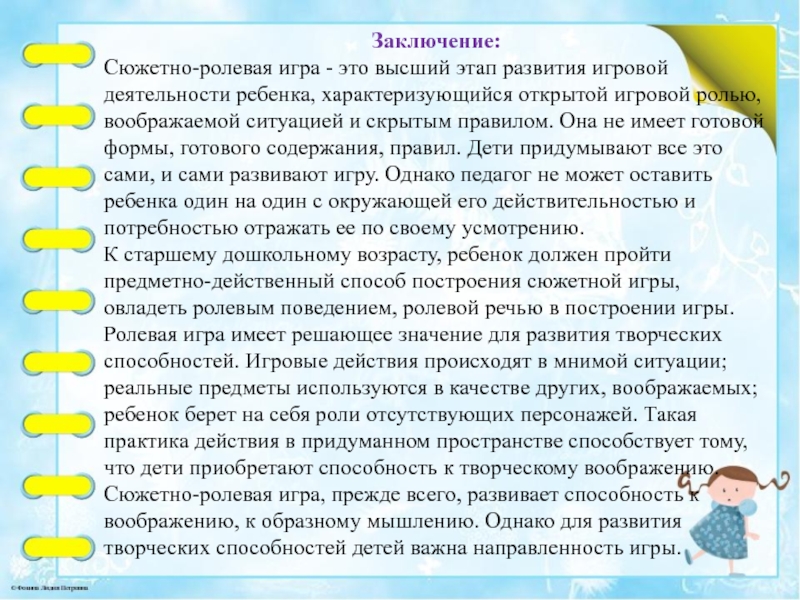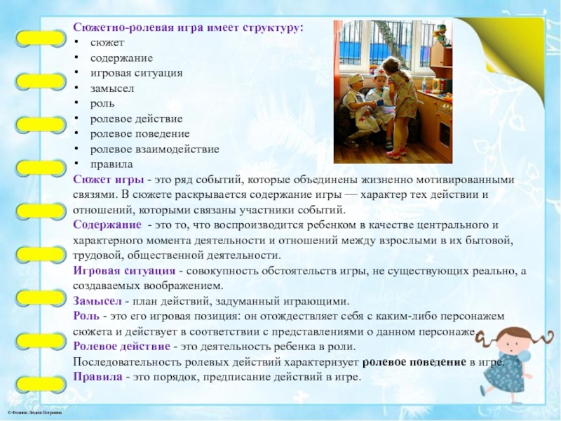 Сюжетно-ролевая игра - это высший этап развития игровой деятельности ребенка, характеризующийся открытой игровой ролью, воображаемой ситуацией и скрытым правилом. Она не имеет готовой формы, готового содержания, правил. Дети придумывают все это сами, и сами развивают игру. Однако педагог не может оставить ребенка один на один с окружающей его действительностью и потребностью отражать ее по своему усмотрению.