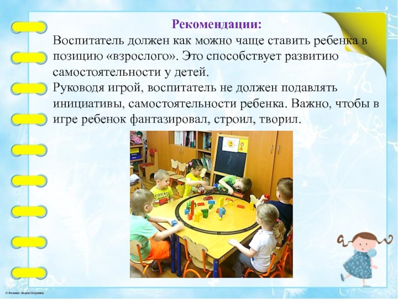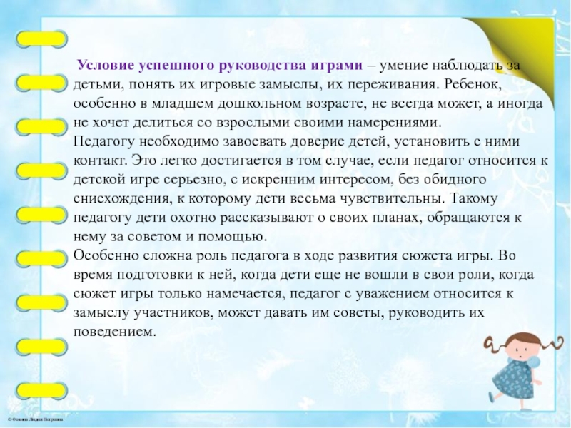 К старшему дошкольному возрасту, ребенок должен пройти предметно-действенный способ построения сюжетной игры, овладеть ролевым поведением, ролевой речью в построении игры.