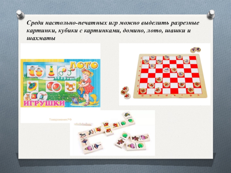 Слайд 5Среди настольно-печатных игр можно выделить разрезные картинки, кубики с картинками, домино,