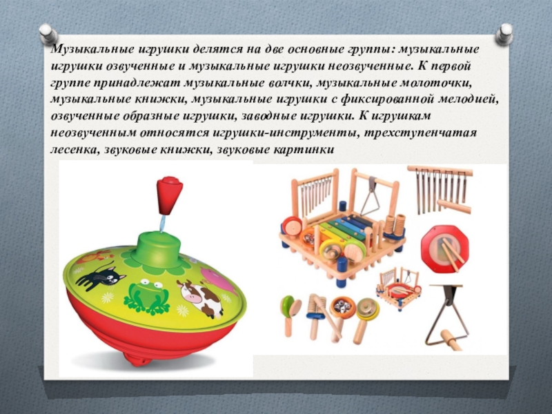 музыкальные игрушки неозвученные. К первой группе принадлежат музыкальные волчки, музыкальные молоточки, музыкальные книжки, музыкальные игрушки с фиксированной мелодией, озвученные образные игрушки, заводные игрушки. К игрушкам неозвученным относятся игрушки-инструменты, трехступенчатая лесенка, звуковые книжки, звуковые картинки