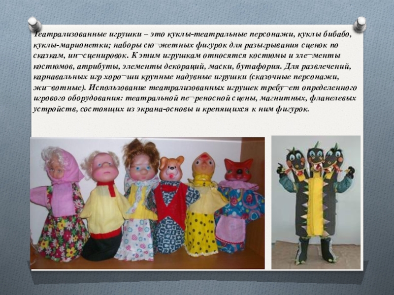 Слайд 8Театрализованные игрушки – это куклы-театральные персонажи, куклы бибабо, куклы-марионетки; наборы сю¬жетных