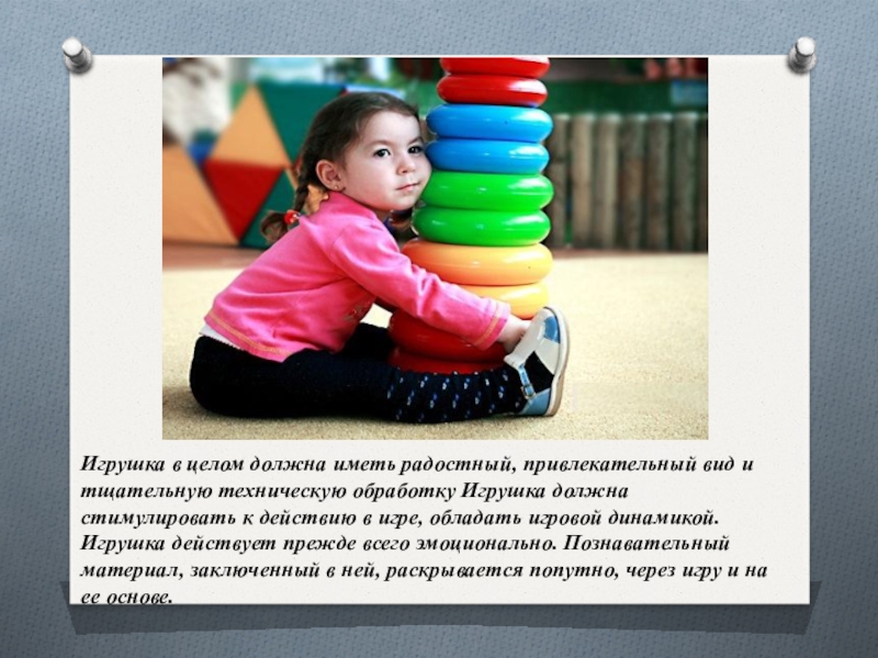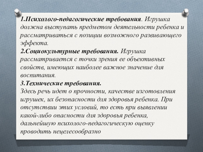 Слайд 111.Психолого-педагогические требования. Игрушка должна выступать предметом деятельности ребенка и рассматриваться с