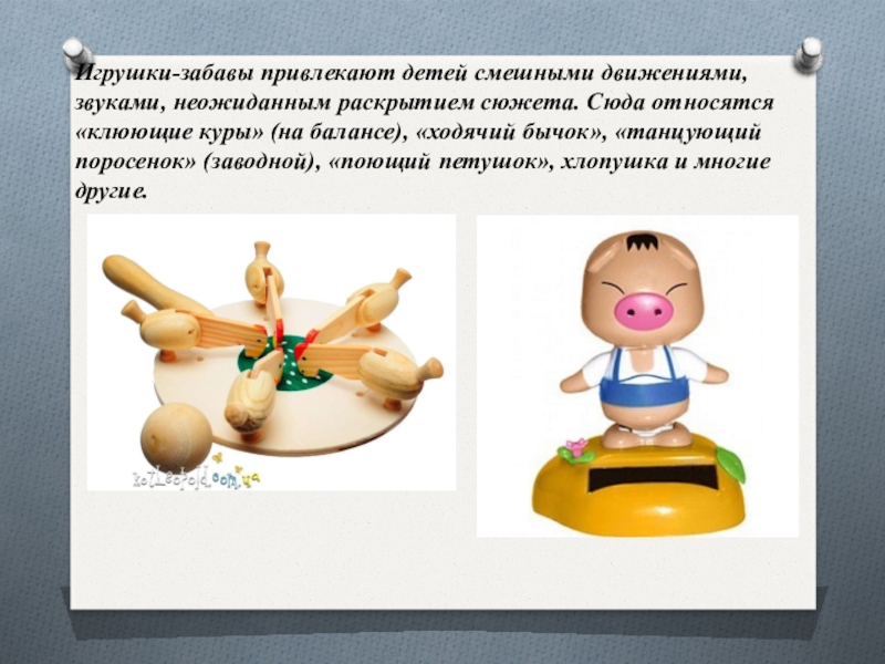 «клюющие куры» (на балансе), «ходячий бычок», «танцующий поросенок» (заводной), «поющий петушок», хлопушка и многие другие.