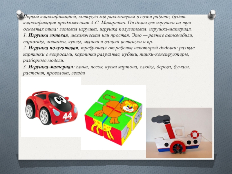 А.С. Макаренко. Он делил все игрушки на три основных типа: готовая игрушка, игрушка полуготовая, игрушка-материал.