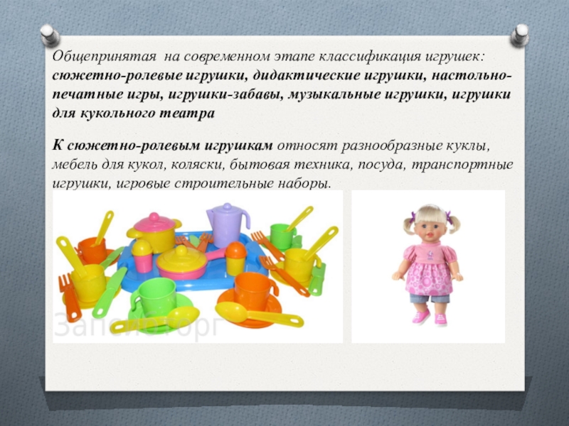 Слайд 3Общепринятая на современном этапе классификация игрушек: сюжетно-ролевые игрушки, дидактические игрушки, настольно-печатные