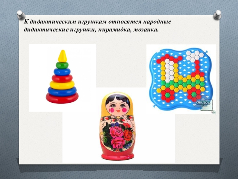 Слайд 4К дидактическим игрушкам относятся народные дидактические игрушки, пирамидка, мозаика.