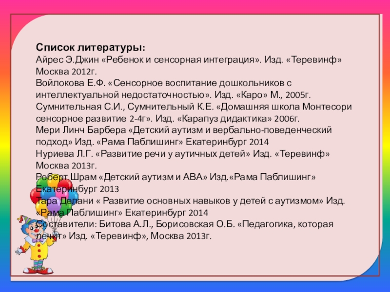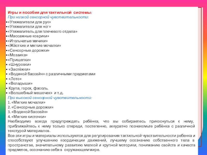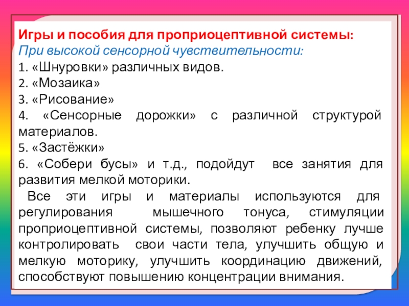 Все эти игры и материалы используются для регулирования мышечного тонуса, стимуляции проприоцептивной системы, позволяют ребенку лучше контролировать свои части тела, улучшить общую и мелкую моторику, улучшить координацию движений, способствуют повышению концентрации внимания.