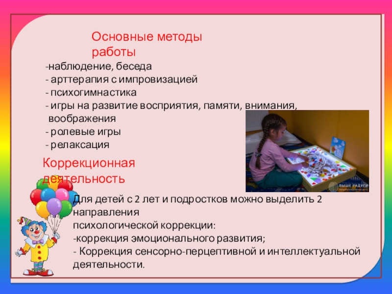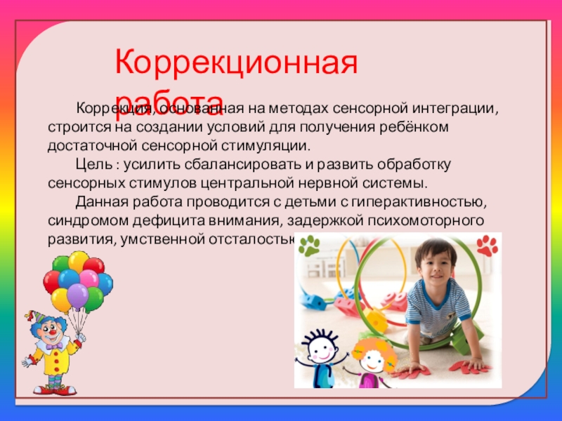 - Коррекция сенсорно-перцептивной и интеллектуальной деятельности.
