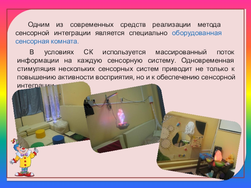 В условиях СК используется массированный поток информации на каждую сенсорную систему. Одновременная стимуляция нескольких сенсорных систем приводит не только к повышению активности восприятия, но и к обеспечению сенсорной интеграции.