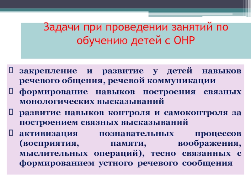 Задачи при проведении занятий по обучению детей с ОНР закрепление и развитие у детей навыков речевого общения,