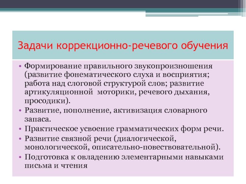 Задачи коррекционно-речевого обученияФормирование правильного звукопроизношения (развитие фонематического слуха и восприятия; работа над слоговой структурой слов; развитие артикуляционной