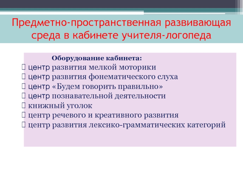 Предметно-пространственная развивающая среда в кабинете учителя-логопеда        Оборудование кабинета: центр развития