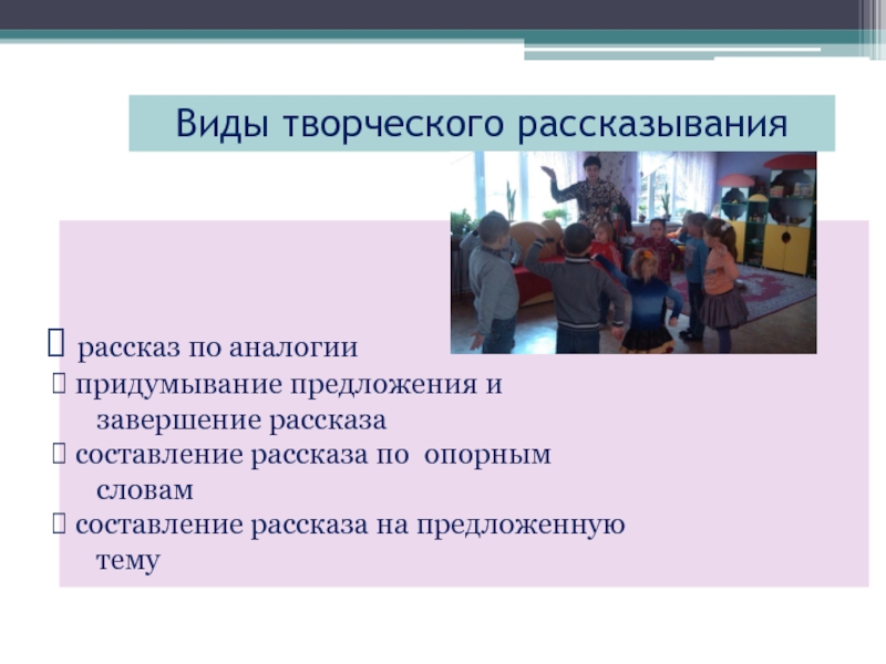 Виды творческого рассказывания рассказ по аналогии придумывание предложения и   завершение рассказа составление рассказа по опорным
