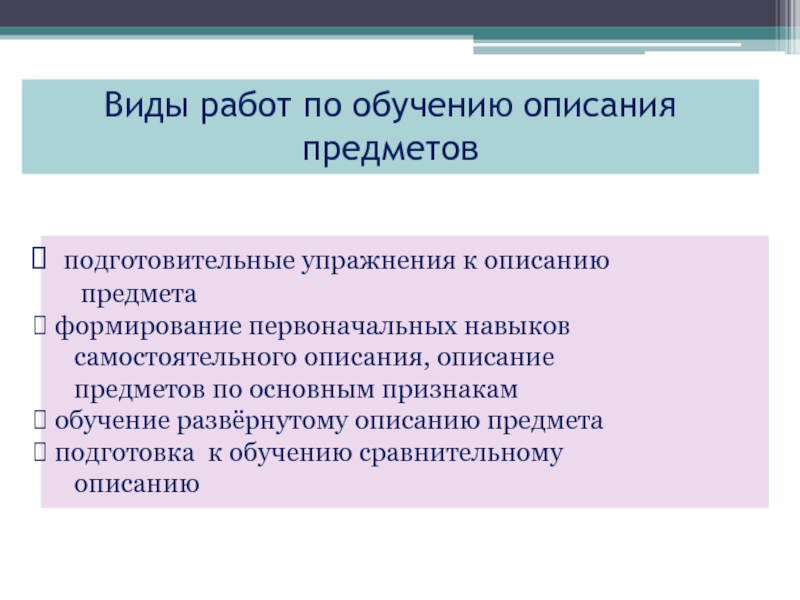 Виды работ по обучению описания предметов подготовительные упражнения к описанию   предмета формирование первоначальных навыков