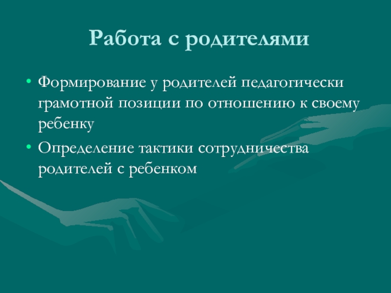 Работа с родителямиФормирование у родителей педагогически грамотной позиции по отношению к своему ребенкуОпределение тактики сотрудничества родителей с