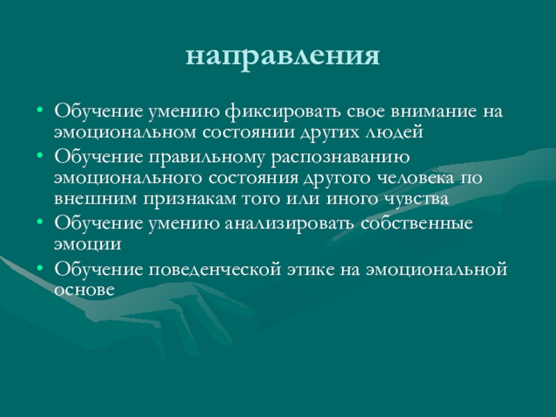направленияОбучение умению фиксировать свое внимание на эмоциональном состоянии других людейОбучение правильному распознаванию эмоционального состояния другого человека по