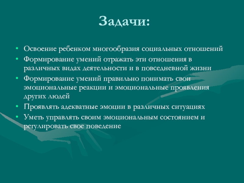 Задачи:Освоение ребенком многообразия социальных отношенийФормирование умений отражать эти отношения в различных видах деятельности и в повседневной жизниФормирование умений правильно понимать свои эмоциональные реакции и эмоциональные проявления других людейПроявлять адекватные эмоции в различных ситуацияхУметь управлять своим эмоциональным