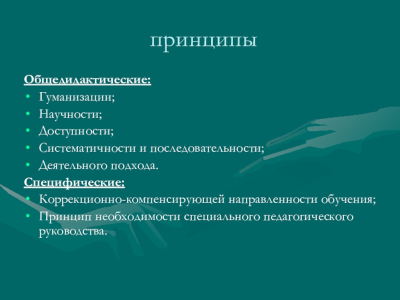 принципыОбщедидактические:Гуманизации;Научности;Доступности;Систематичности и последовательности;Деятельного подхода.Специфические:Коррекционно-компенсирующей направленности обучения;Принцип необходимости специального педагогического руководства.