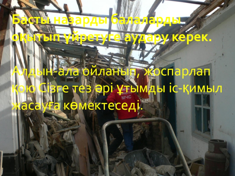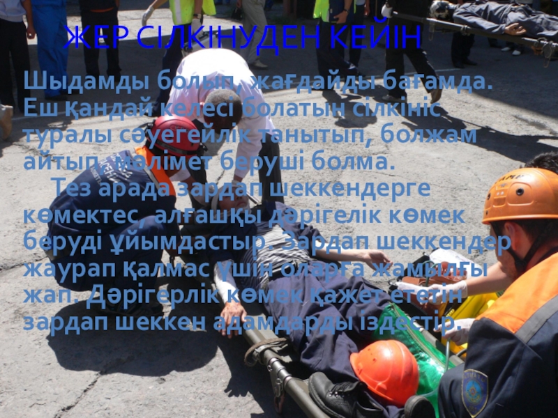 Тез арада зардап шеккендерге көмектес, алғашқы дәрігелік көмек беруді ұйымдастыр. Зардап шеккендер жаурап қалмас үшін оларға жамылғы жап. Дәрігерлік көмек қажет ететін зардап шеккен адамдарды іздестір.