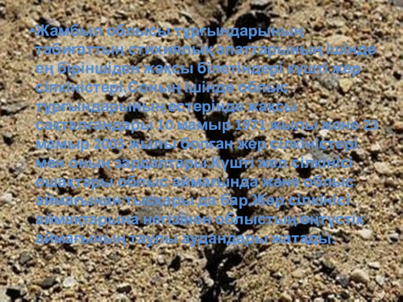 Жамбыл облысы тұрғындарының табиғаттың стихиялық апаттарының ішінде ең біріншіден жақсы білетіндері күшті жер сілкіністері.Соның ішінде облыс тұрғындарының естерінде жақсы сақталғандары 10 мамыр 1971 жылы және 23 мамыр 2003 жылы болған жер сілкіністері мен оның зардаптары.Күшті жел сілкінісі ошақтары облыс аймағында және облыс аймағынан тысқары да бар.Жер сілкінісі аймақтарына негізінен облыстың оңтүстік аймағының таулы аудандары жатады.