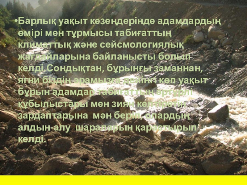 Барлық уақыт кезеңдерінде адамдардың өмірі мен тұрмысы табиғаттың климаттық және сейсмологиялық жағдайларына байланысты болып келді.Сондықтан, бұрынғы заманнан, яғни біздің эрамызға дейінгі көп уақыт бұрын адамдар табиғаттың әртүрлі құбылыстары мен зиян келтіретін зардаптарына мән беріп, олардың алдын-алу шараларын қарастырып келді.