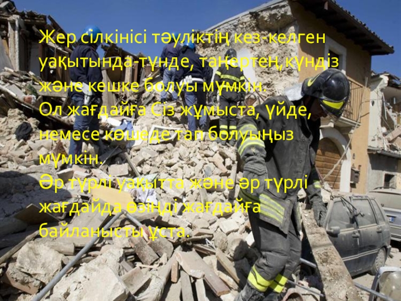 Жер сілкінісі тәуліктің кез-келген уақытында-түнде, таңертең,күндіз және кешке болуы мүмкін.