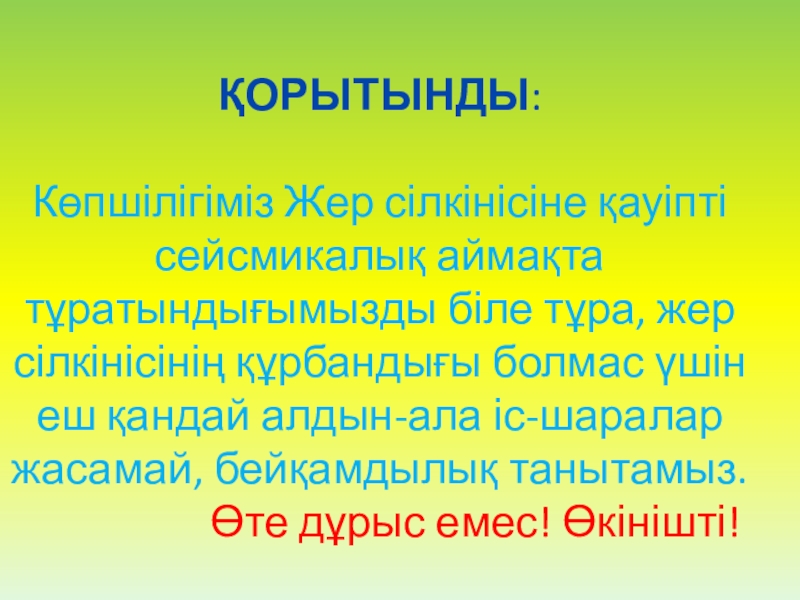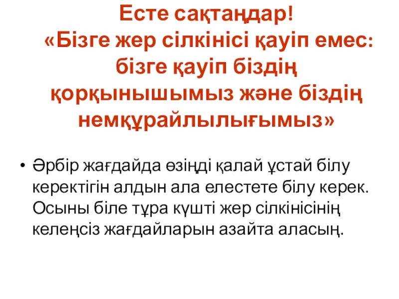 Әрбір жағдайда өзіңді қалай ұстай білу керектігін алдын ала елестете білу керек. Осыны біле тұра күшті жер сілкінісінің келеңсіз жағдайларын азайта аласың.