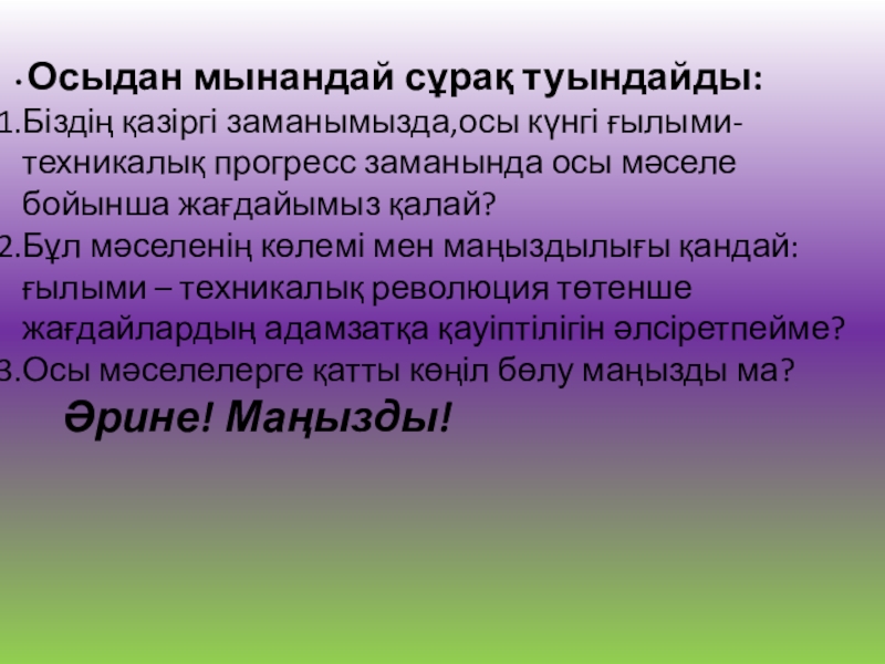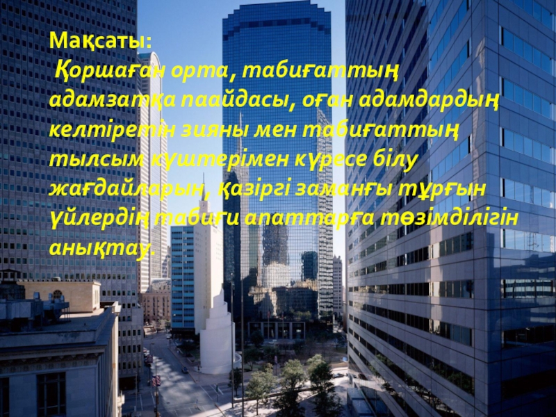 Қоршаған орта, табиғаттың адамзатқа паайдасы, оған адамдардың келтіретін зияны мен табиғаттың тылсым күштерімен күресе білу жағдайларын, қазіргі заманғы тұрғын үйлердің табиғи апаттарға төзімділігін анықтау.
