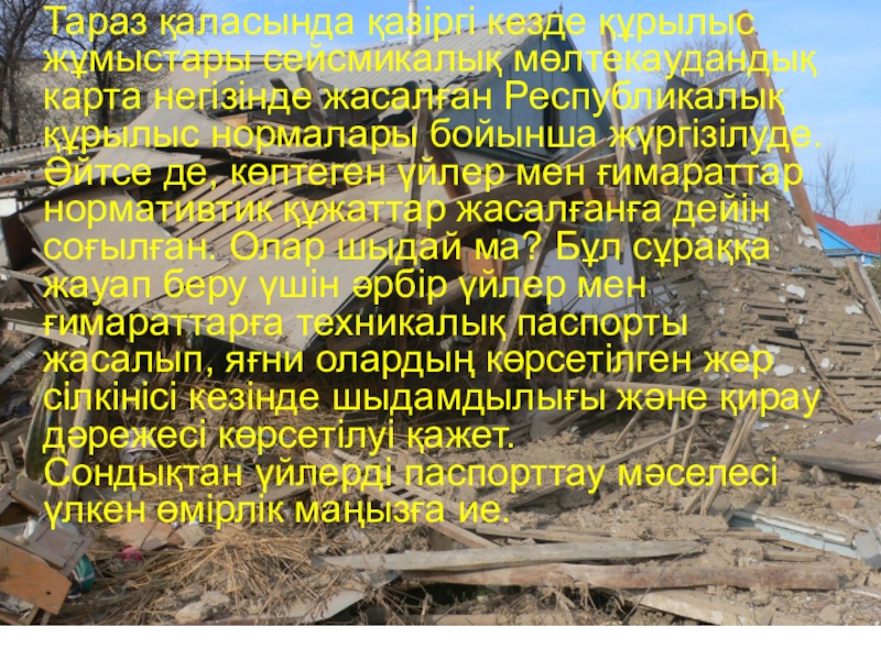 Әйтсе де, көптеген үйлер мен ғимараттар нормативтик құжаттар жасалғанға дейін соғылған. Олар шыдай ма? Бұл сұраққа жауап беру үшін әрбір үйлер мен ғимараттарға техникалық паспорты жасалып, яғни олардың көрсетілген жер сілкінісі кезінде шыдамдылығы және қирау дәрежесі көрсетілуі қажет.