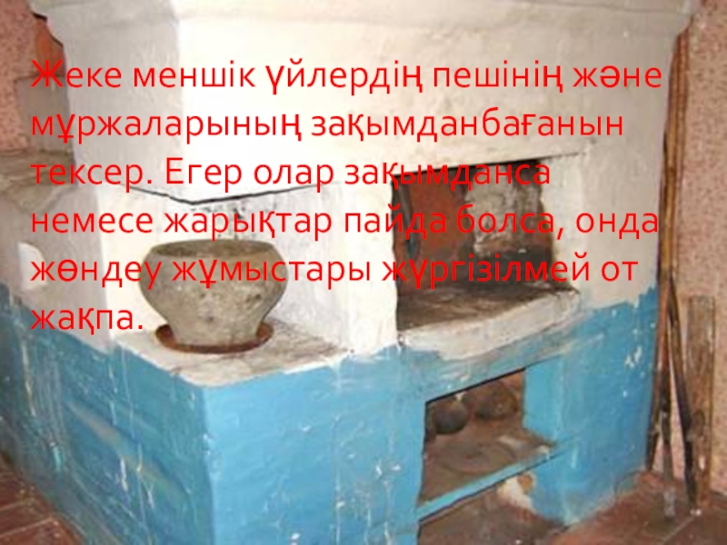 Жеке меншік үйлердің пешінің және мұржаларының зақымданбағанын тексер. Егер олар зақымданса немесе жарықтар пайда болса, онда жөндеу жұмыстары жүргізілмей от жақпа.