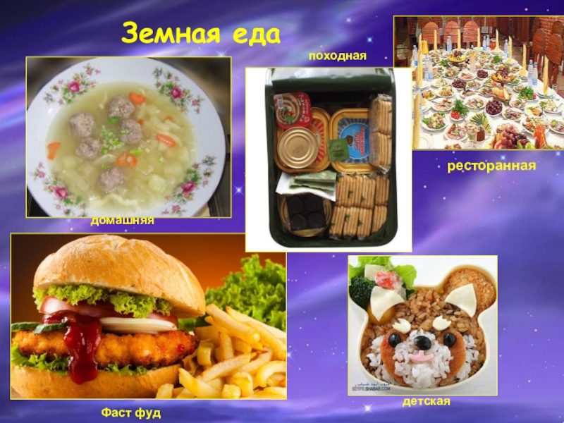 Земная едадомашняяпоходнаярестораннаяФаст фуддетская